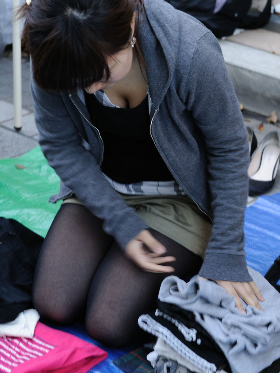 アパレル系だけではとどまらず、フリーマーケットで1つでも多くの商品を売ろうと必死な女性が、前かがみになった瞬間も胸チラ盗撮のターゲットとされてしまった素人女性たちの胸チラ盗撮画像