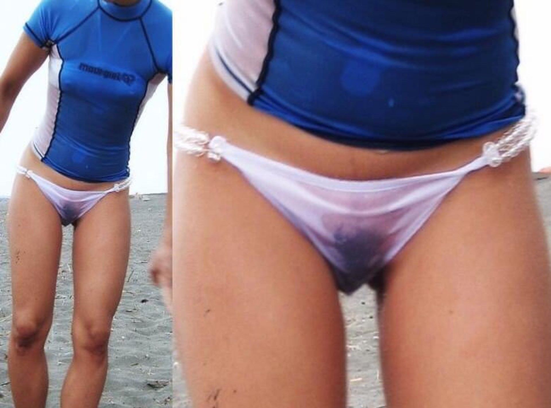 【水着透けマン毛エロ画像】海やプールで遊ぶ一般女性の水着が透け事故…処理してない剛毛マン毛が丸見えww